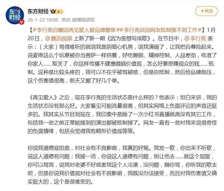 这一招,精准击中了李行亮的命门。“我可以不在乎被骂被喷,”他坦言,“但是你抵制,然后给品牌施压,这个伤害值很高。”节目带来的高流量,并未转化为工作邀约,反而成了负资产。他透露,从节目播出到现在,除了一次小红书直播,再没接到其他工作,连以前能正常接到的演出也被抵制掉了。甚至在新疆塔城演出候场时,都因遭举报而临时取消。那句“前天又撤了好几个单”,轻描淡写背后,是实实在在的生计冲击。面对汹涌的指责,李行亮感到既冤屈又无力。网友将对他婚姻表现的批评,上升到了“道德观扭曲”、“对社会有不良影响”的高度,这让他难以接受。“你骂我对老婆不好或者我这个人冷漠,没问题,随你骂,”他说,“但是你说我价值观对社会有不良影响,我既没办法接受,而且对我伤害值又确实挺大的。”在他看来,观众可以将对节目中角色的反感投射到他身上,但因此否定他作为歌手的全部,甚至阻断其工作渠道,是一种越界的惩罚。